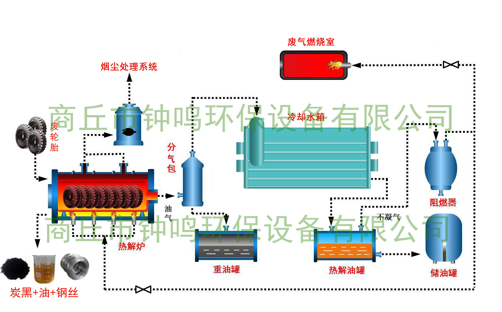 為了解決廢舊輪胎,本廠生產(chǎn)的輪胎裂解設(shè)備確保無三廢排放。設(shè)備有尾氣燃燒再利用裝置,確保無味。以燃料裂解油為例(也可以用天然氣),設(shè)備配有除塵器,煙塵排放達(dá)標(biāo),整個(gè)循環(huán)冷卻系統(tǒng)水循環(huán)且無污染,絕無廢水排放;廢渣因經(jīng)過500多度的高溫處理,無任何的毒性碳黑,且炭黑可以精煉,應(yīng)用范圍很廣,不凝氣是廢輪胎熱解的能量來源,油品和熱解炭黑為廢輪胎熱解的主要產(chǎn)品,而從產(chǎn)品的品質(zhì)和價(jià)值講,裂解設(shè)備很好的解決了垃圾污染問題,不會(huì)造次二次污染。在解決問題的同時(shí)也創(chuàng)造了巨大的經(jīng)濟(jì)效益。